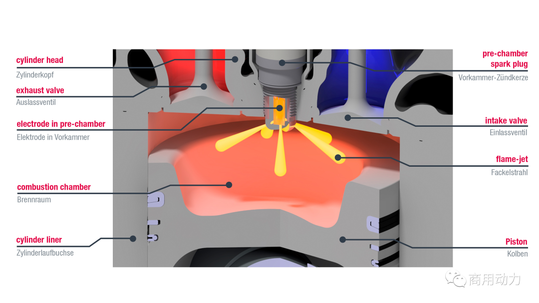 此外,帶有預(yù)燃室火花塞的MAN發(fā)動機(jī)具有更好的燃燒質(zhì)量:預(yù)燃室火花塞配有徑向排列的孔,可提供與主燃燒室的連接。在壓縮階段活塞向上運(yùn)動期間,可燃?xì)怏w-新鮮空氣混合物通過孔進(jìn)入預(yù)燃室,在那里被點(diǎn)燃。由于結(jié)構(gòu)和結(jié)構(gòu)設(shè)計(jì),主燃燒室中的燃?xì)?空氣混合物可以被預(yù)燃室逸出的高能火焰射流更好地點(diǎn)燃,從而可以安全地點(diǎn)燃稀薄混合物。預(yù)燃室中的最佳點(diǎn)火是通過幾個(gè)排列成星形的點(diǎn)火源實(shí)現(xiàn)的。“使用預(yù)燃室火花塞,我們可以將系統(tǒng)效率提高多達(dá)一個(gè)百分點(diǎn)。